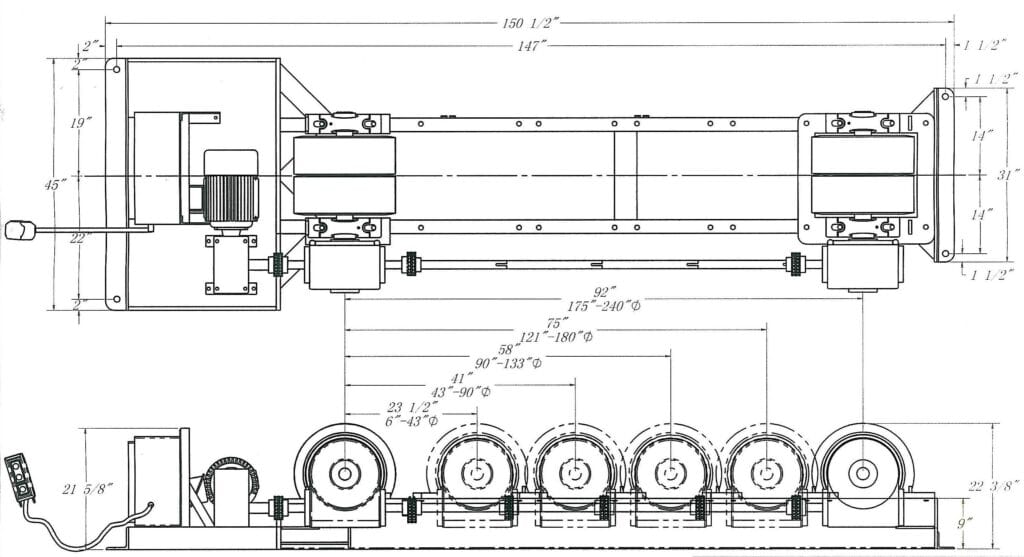 Webb Model R1000-20 Portable Heavy Duty Turning Roll, AC variable speed drive w/ overload and under voltage protection. Forward-reverse-stop switch, speed dial, and rapid advance pendant controls mounted on the end of a 30’ control cable (optional 30’ extension and Forward/Reverse foot switch available).